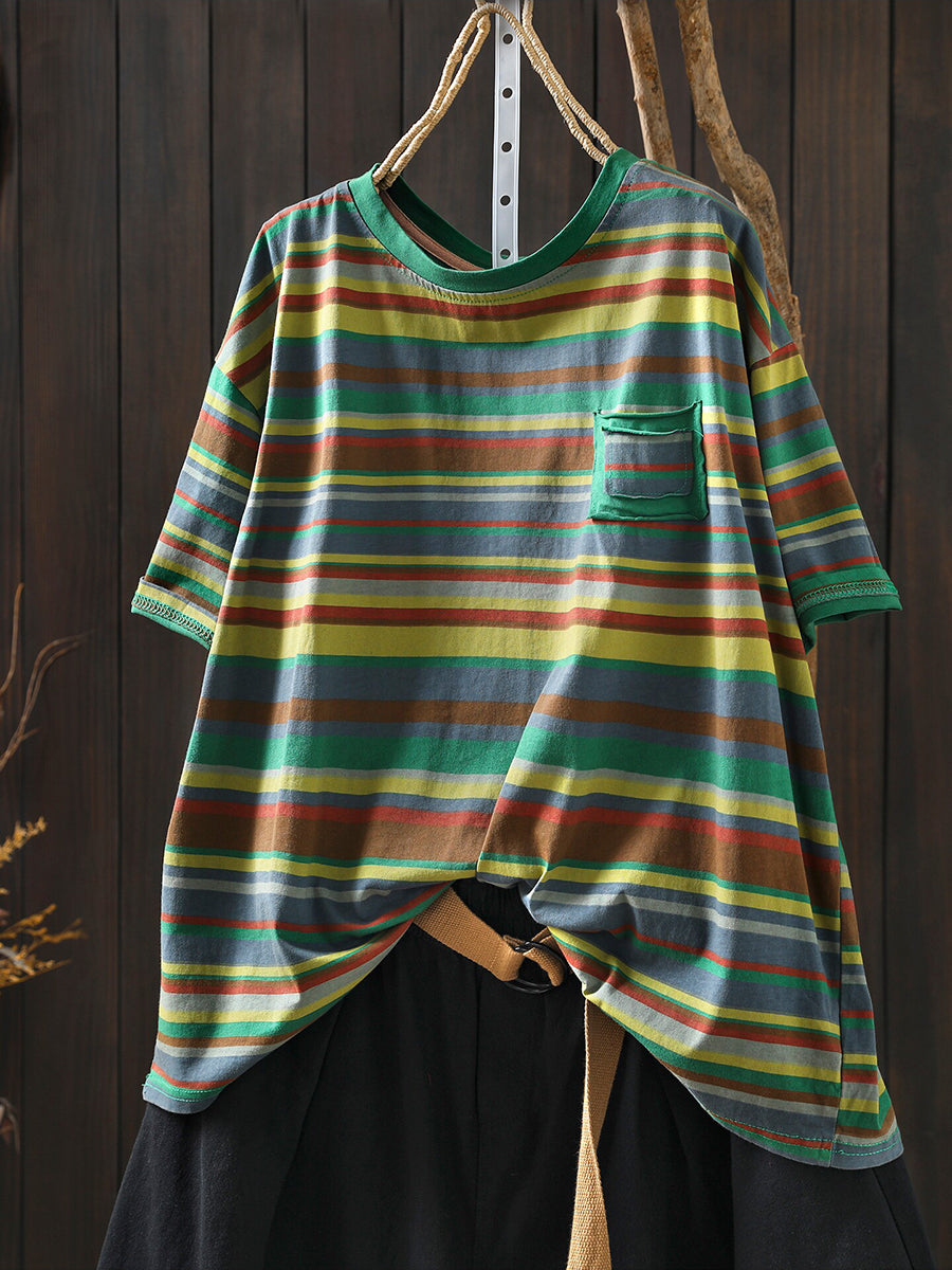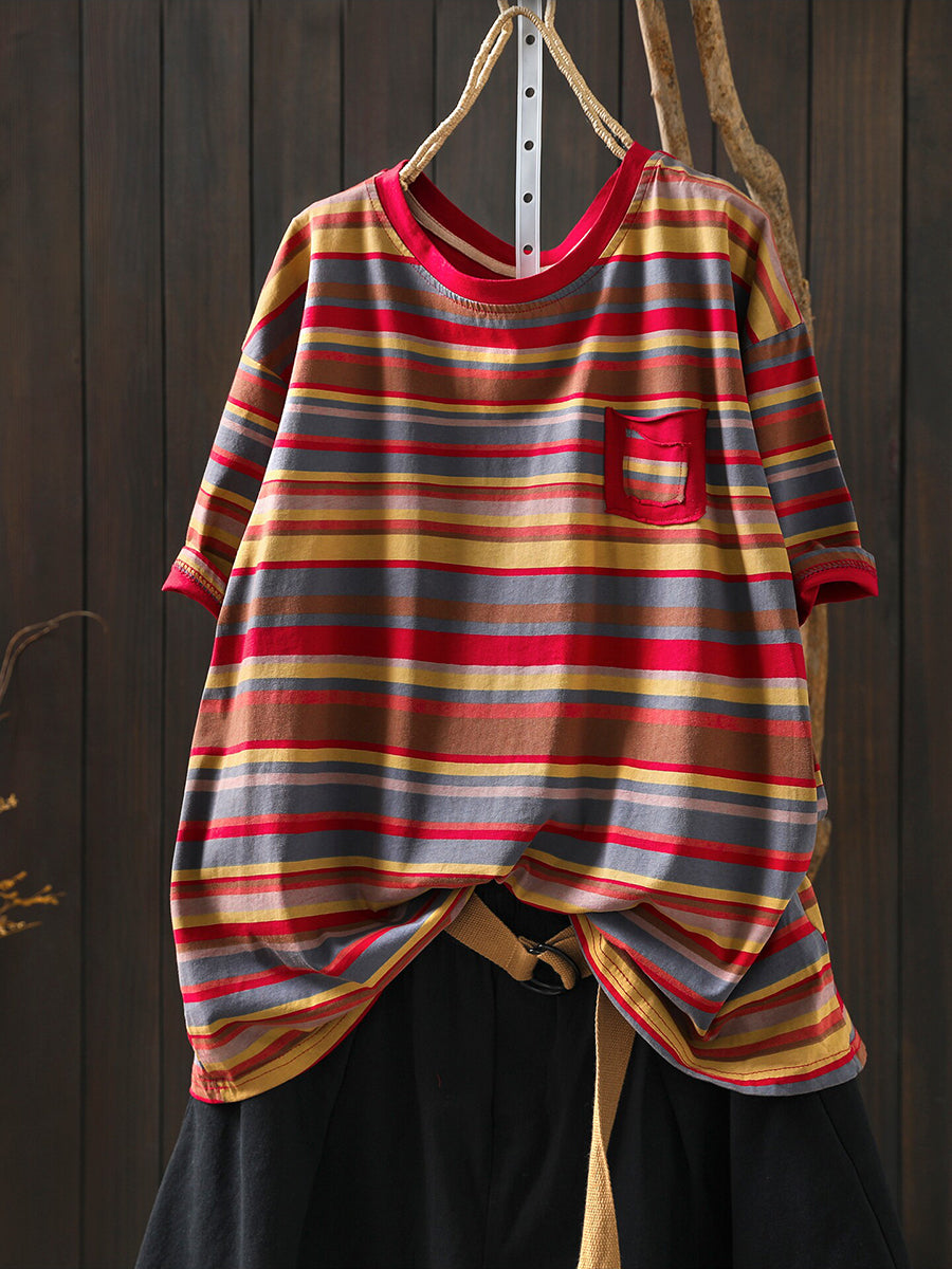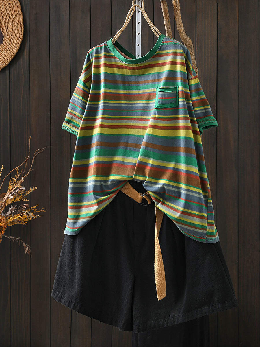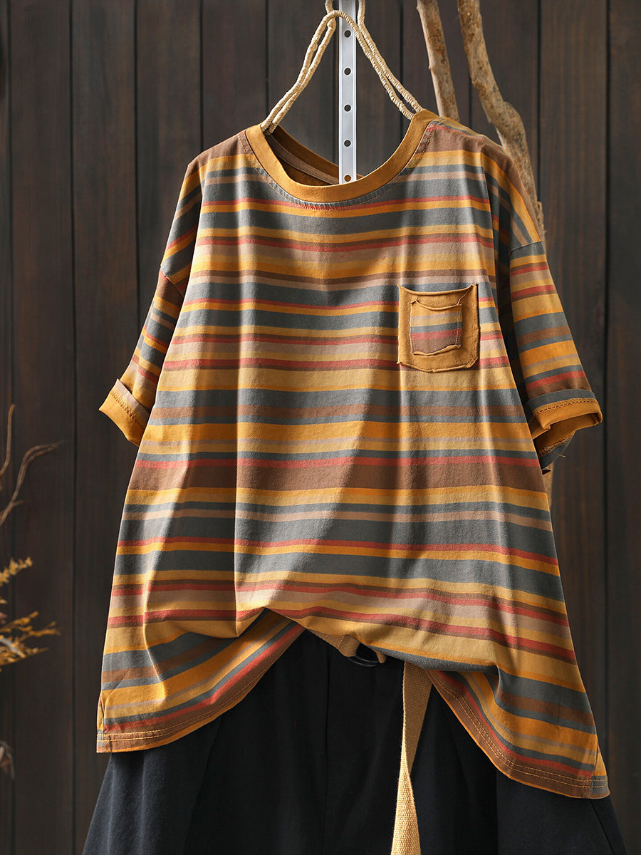 חולצת O-צוואר כותנה עם פסים מזדמנים לקיץ לנשים