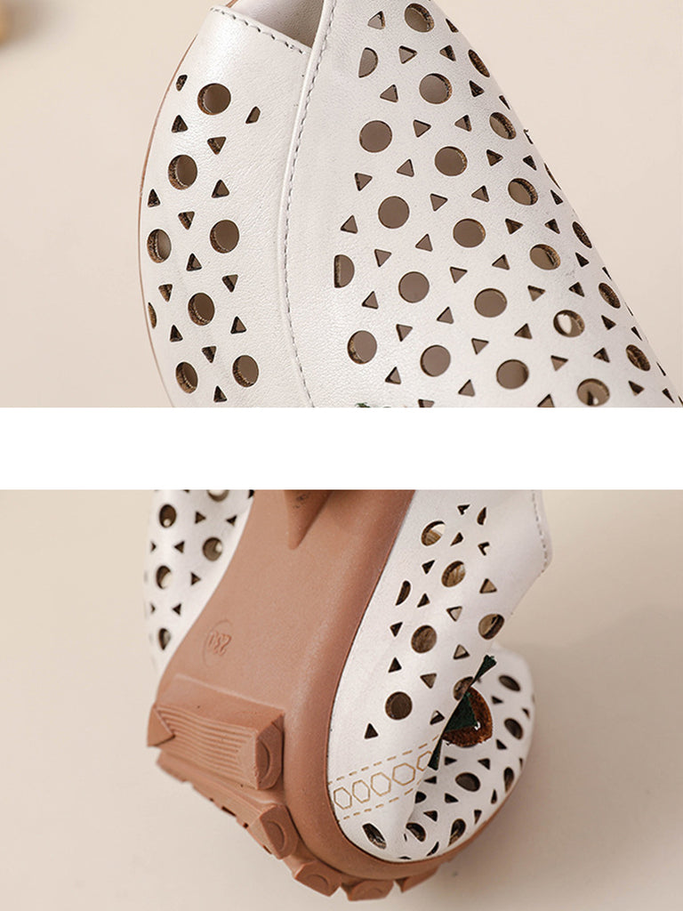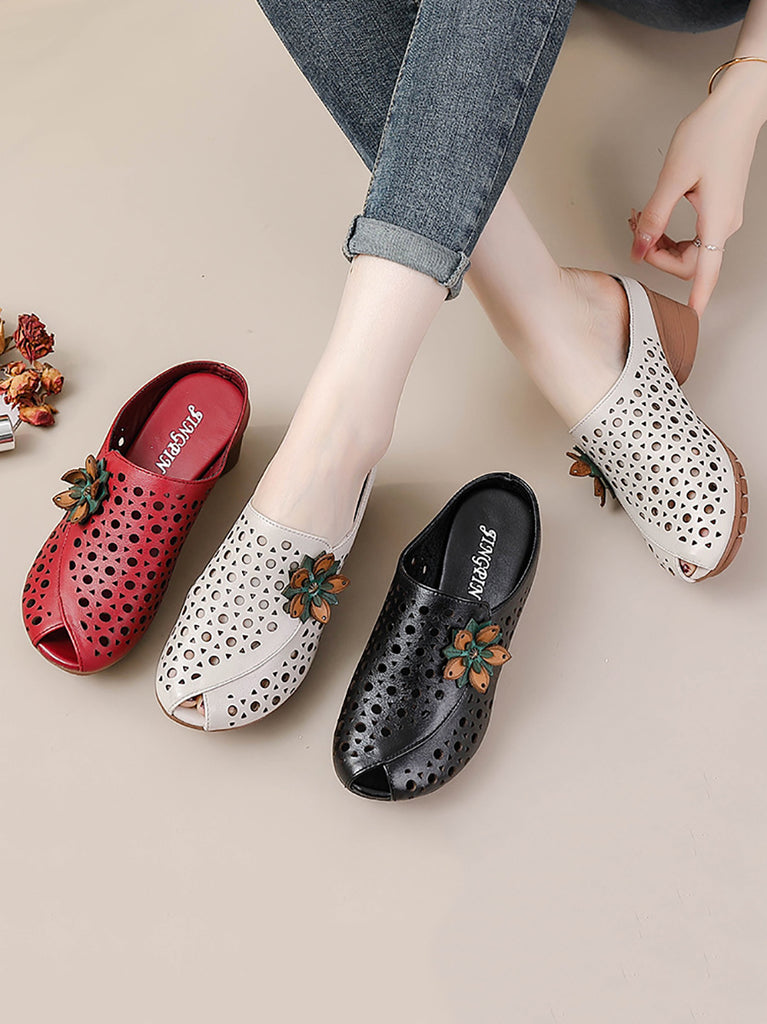 נעלי בית קיץ מעור אמיתי עם עקב בינוני פרחוני לנשים