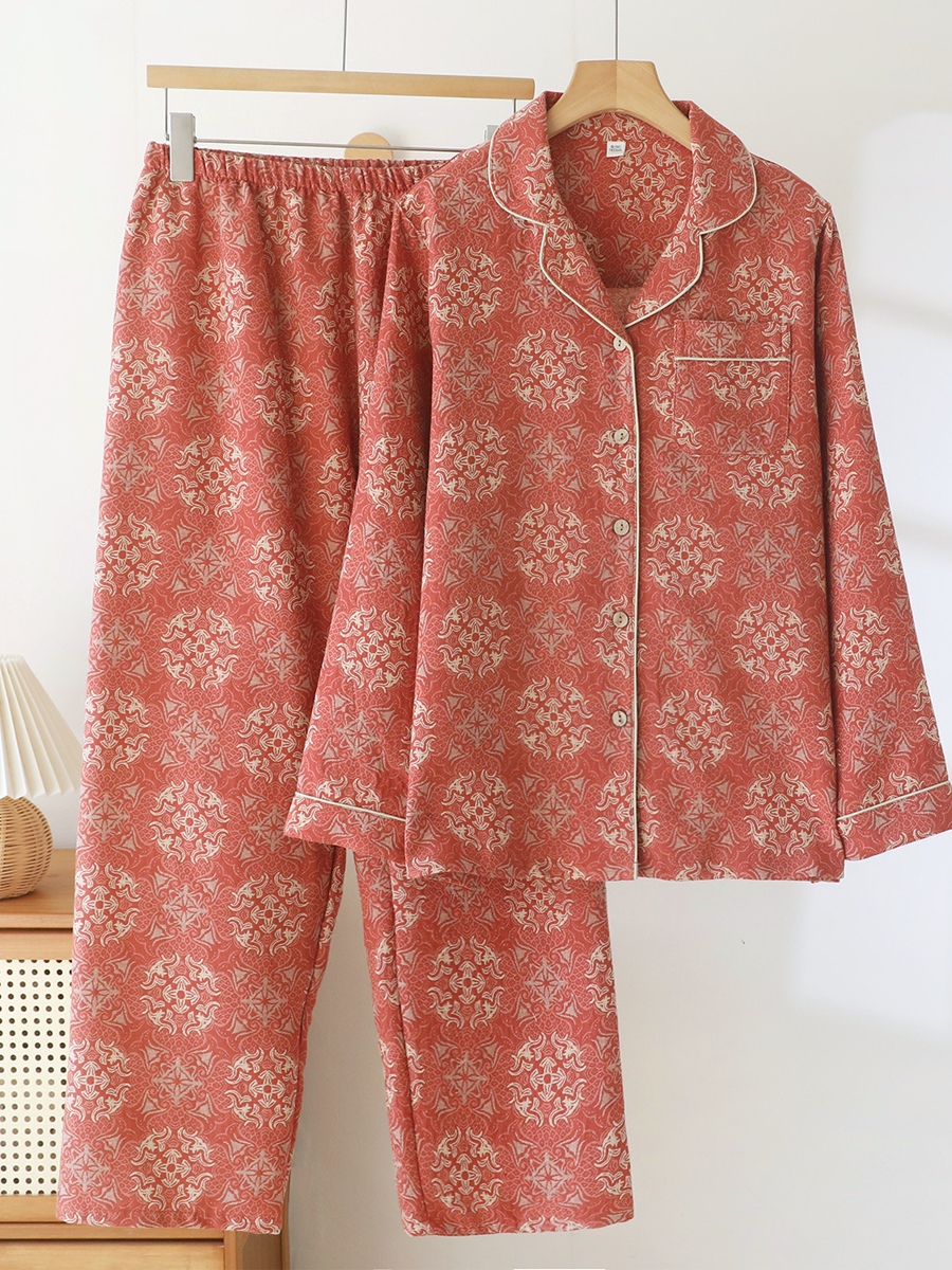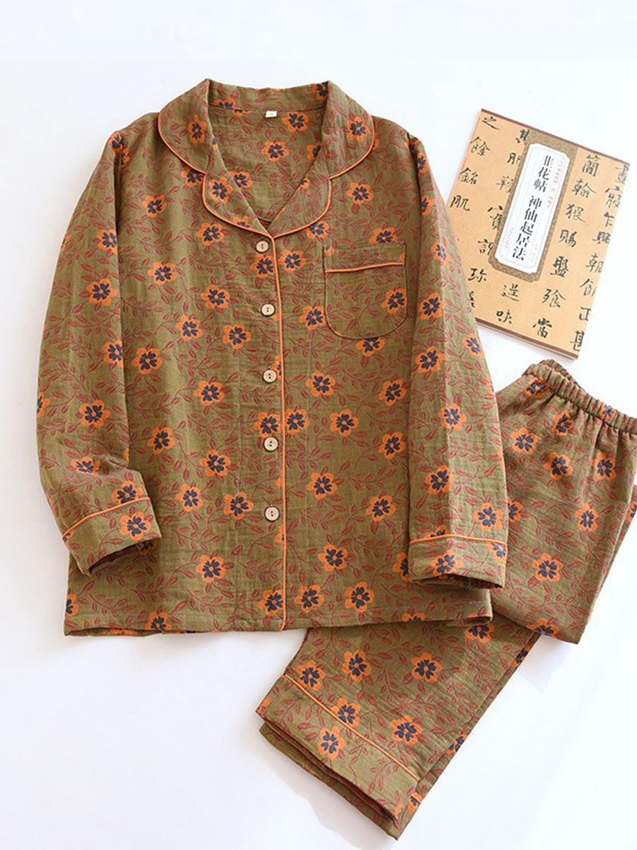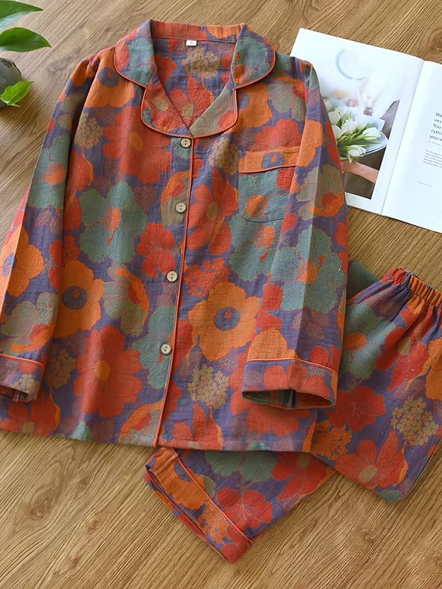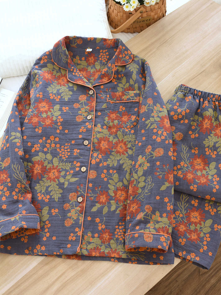 ה סט פיג'מות פרחוניות לנשים לקיץ עשוי מגזה ז'קארד רכה לנוחות. סט מסוגנן זה כולל צווארון V, דוגמת פרחים, שרוולים ארוכים וגומי במותן, עם מכנסיים באורך מלא המושלמים להירגעות בבית.