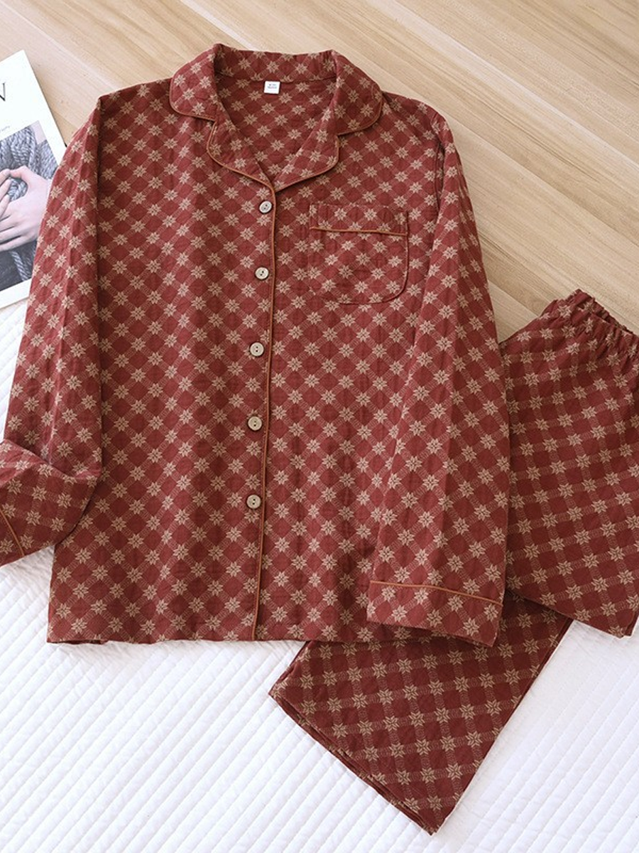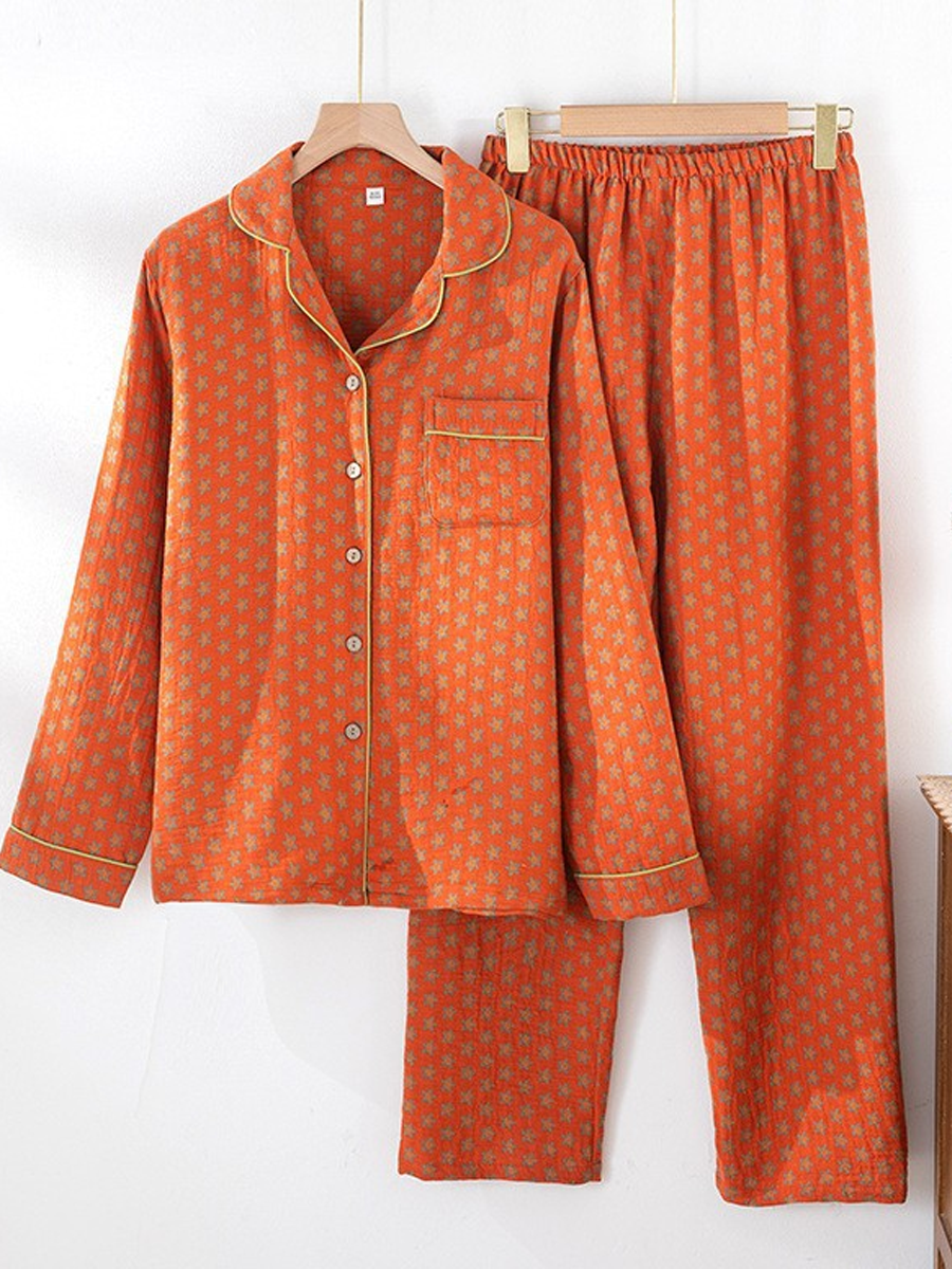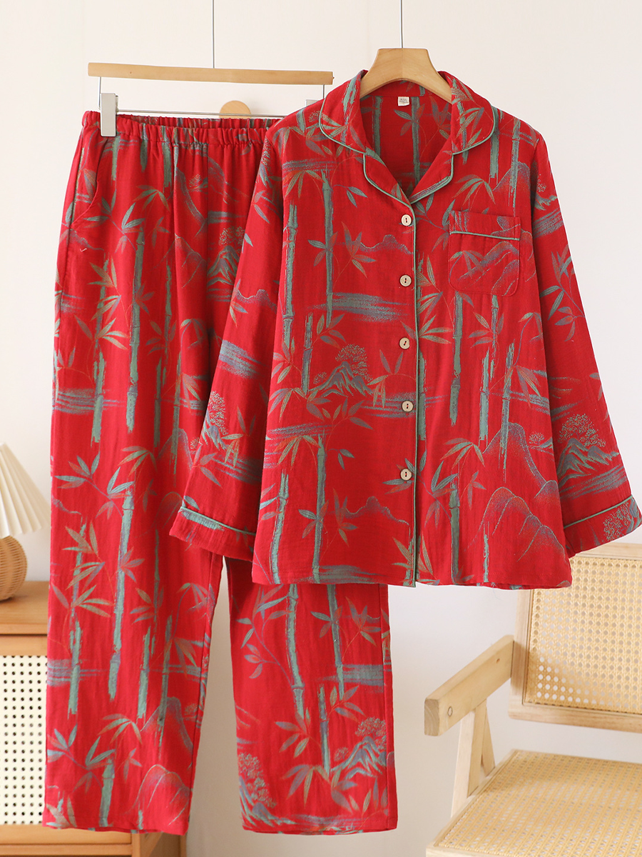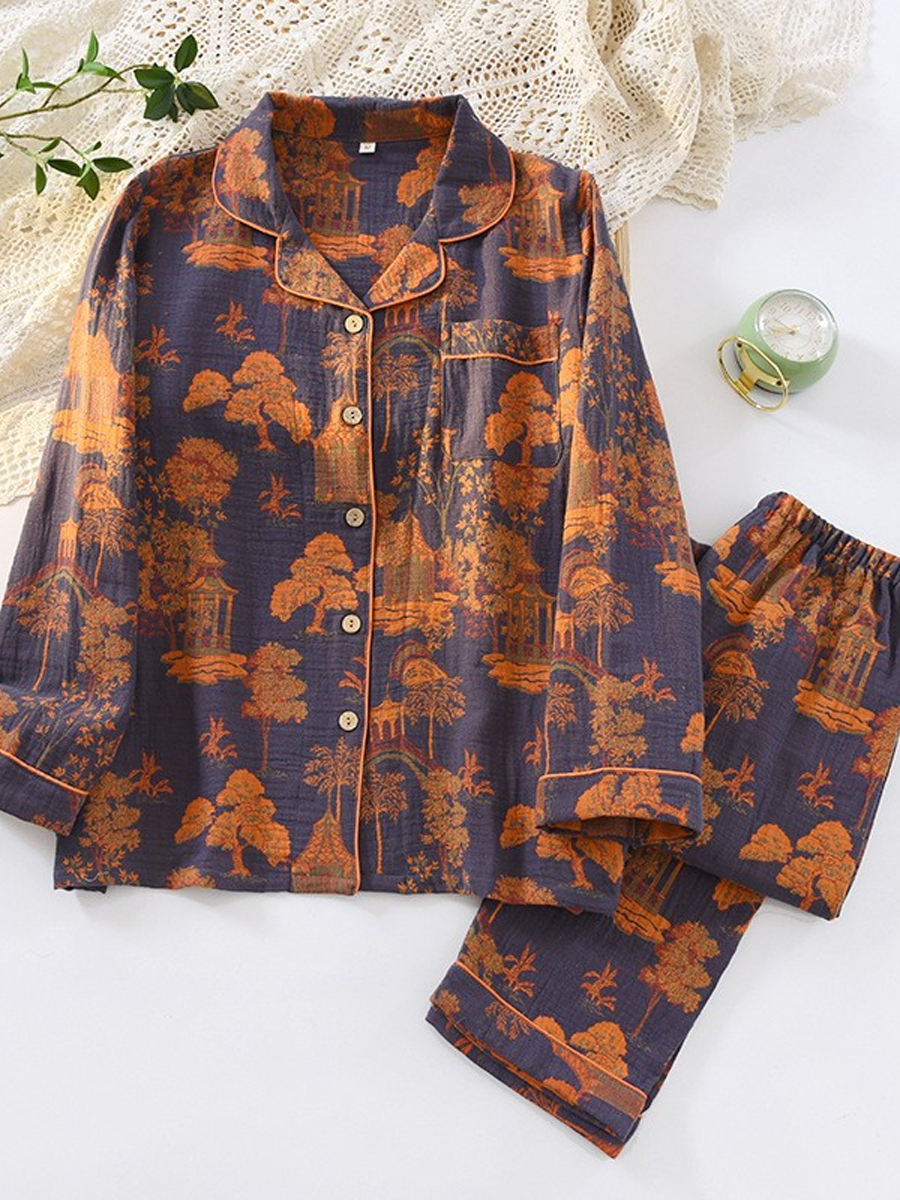 ה סט פיג'מות פרחוניות לנשים לקיץ עשוי מגזה ז'קארד רכה לנוחות. סט מסוגנן זה כולל צווארון V, דוגמת פרחים, שרוולים ארוכים וגומי במותן, עם מכנסיים באורך מלא המושלמים להירגעות בבית.