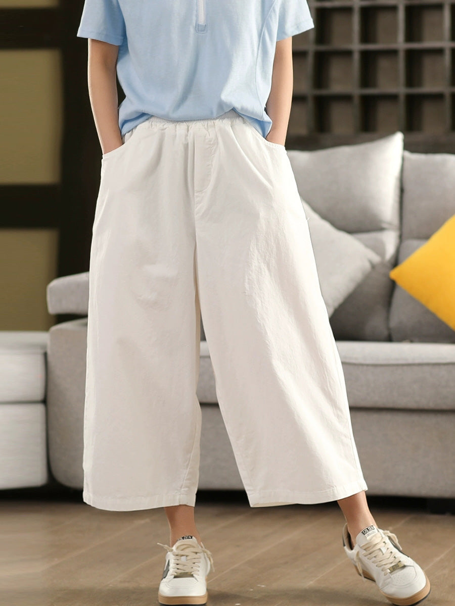 נשים קיץ צבע טהור 100%כותנה מכנסיים רחבים