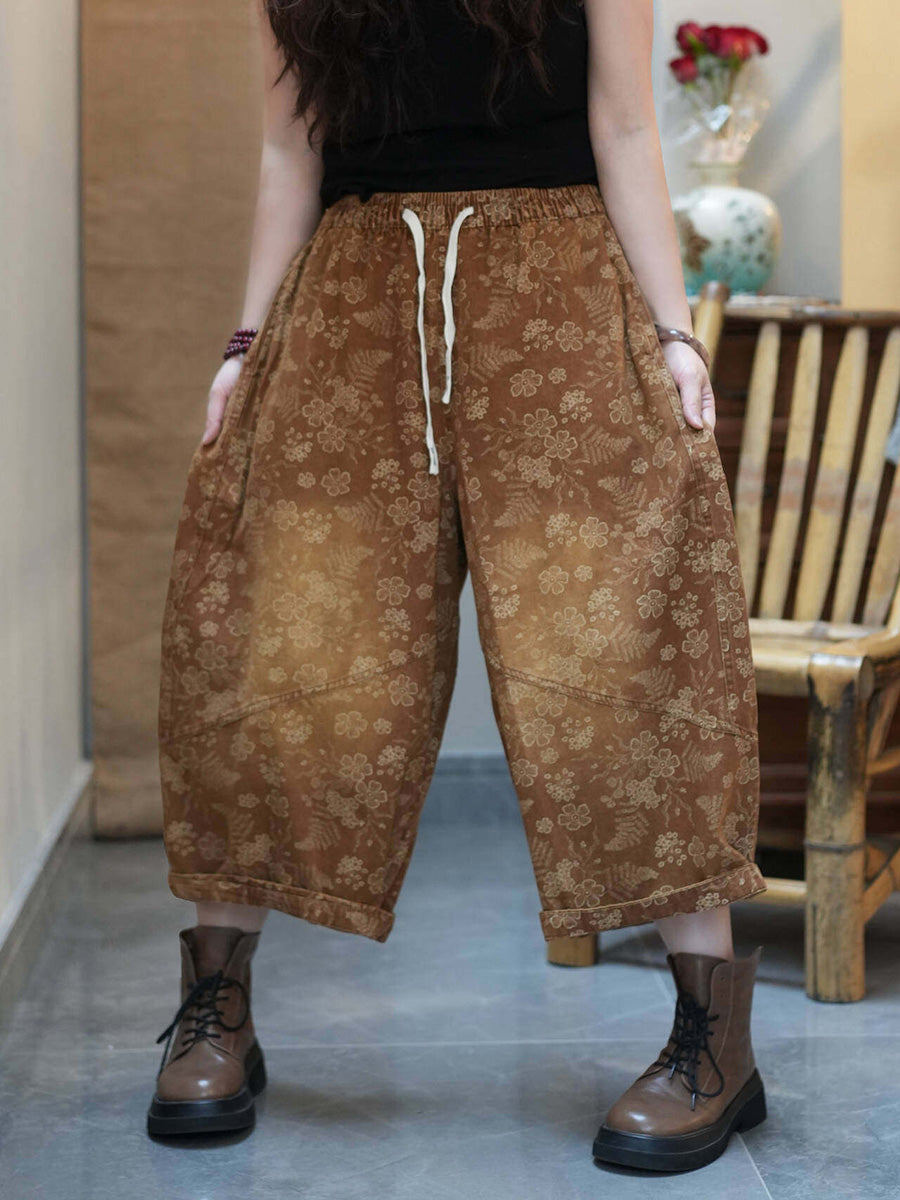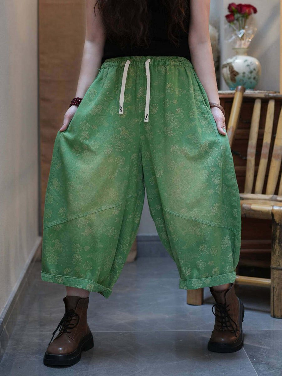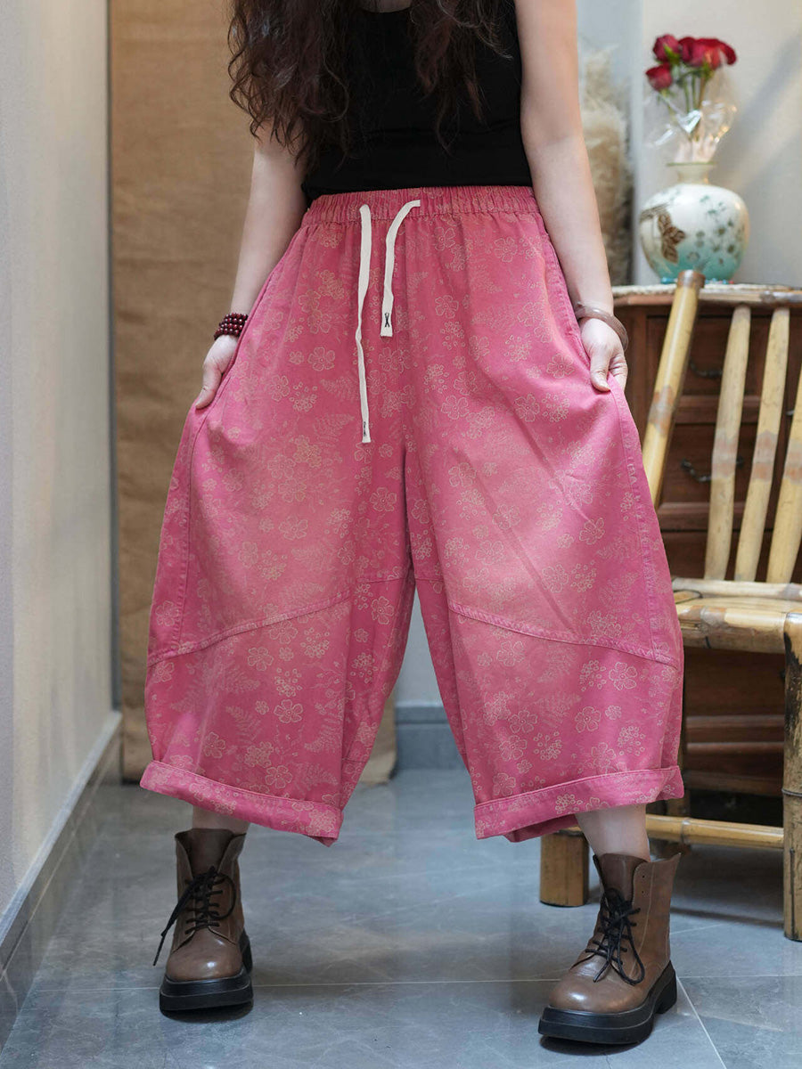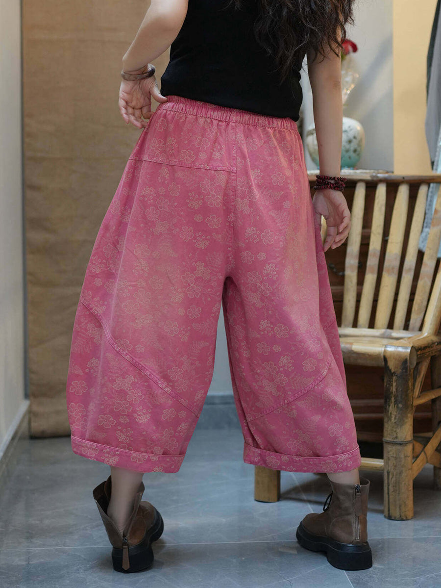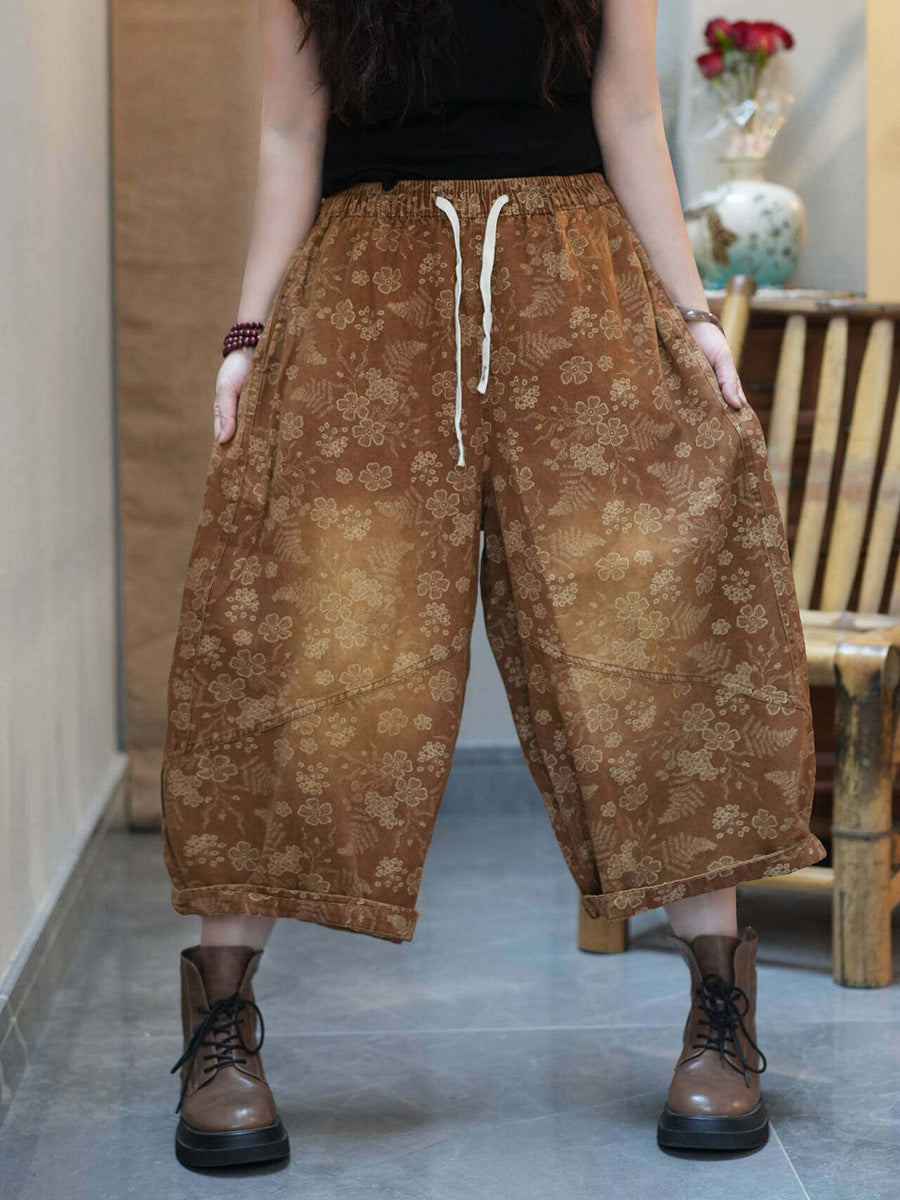 מכנסי קיץ רחבים בגזרה רטרו עם פרחים לנשים