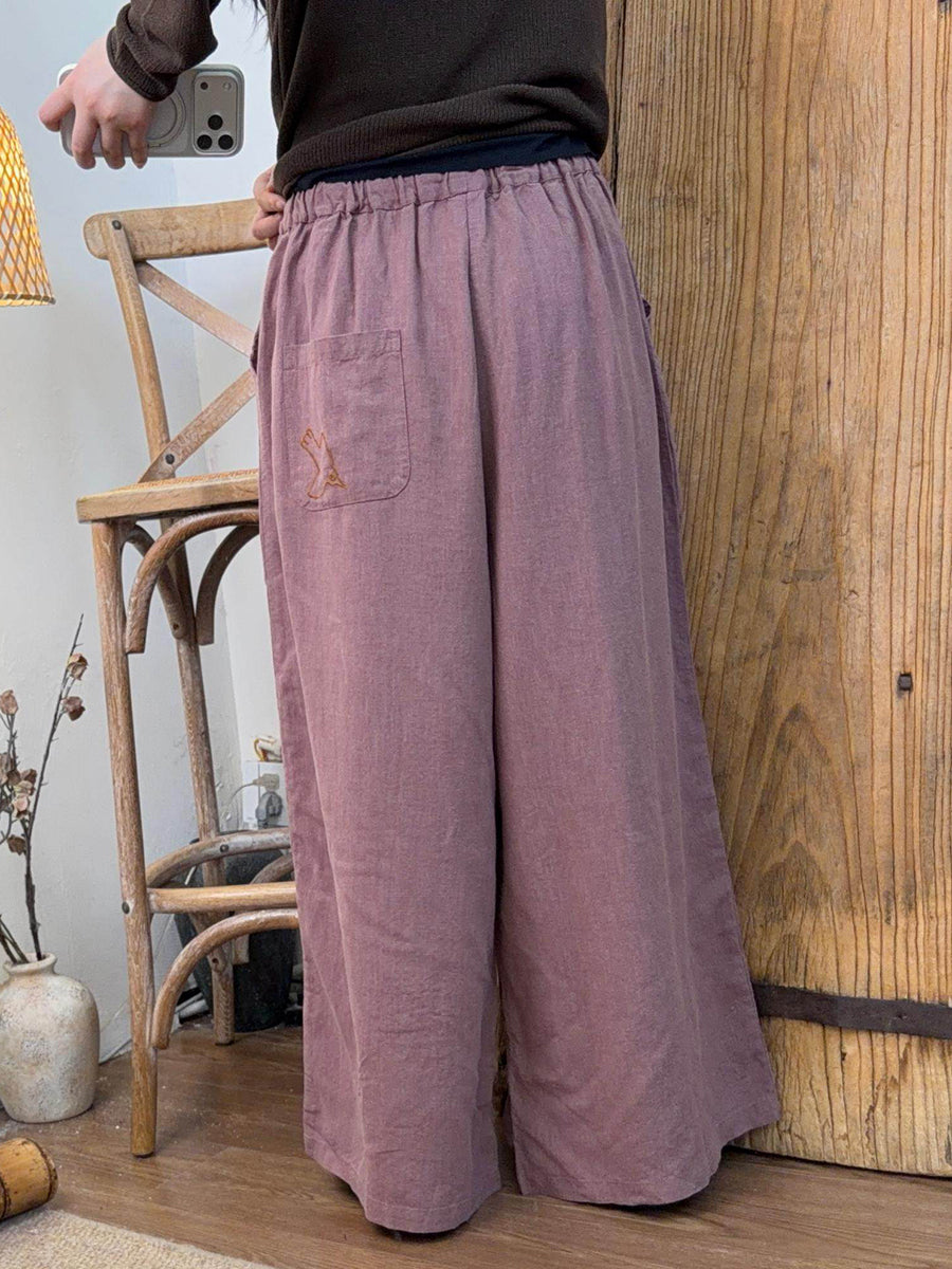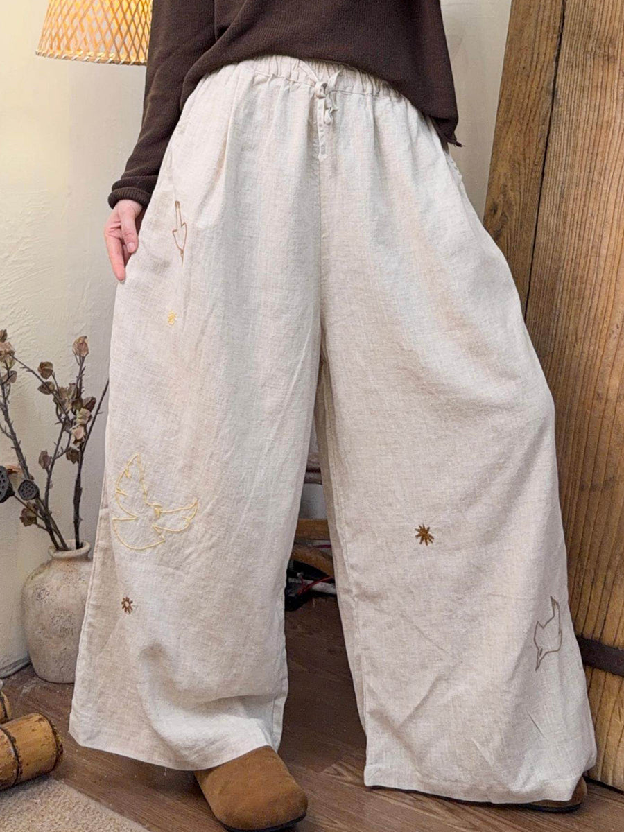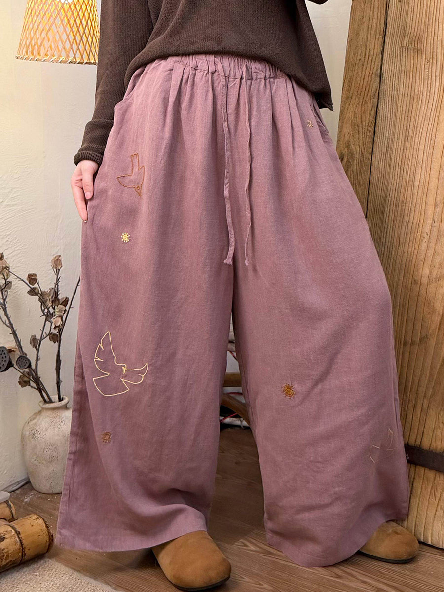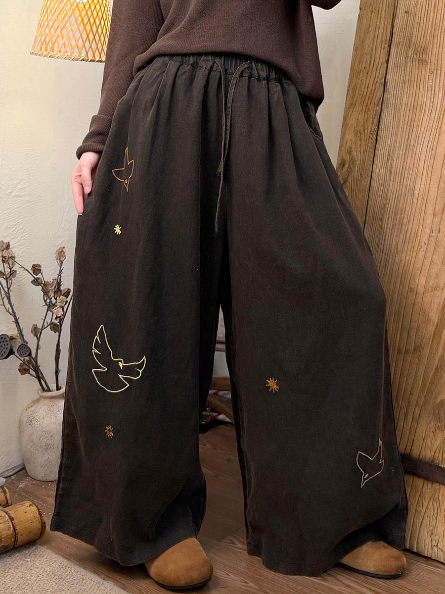 מכנסי חורף רחבים עם רקמת ציפורים אומנותית לנשים