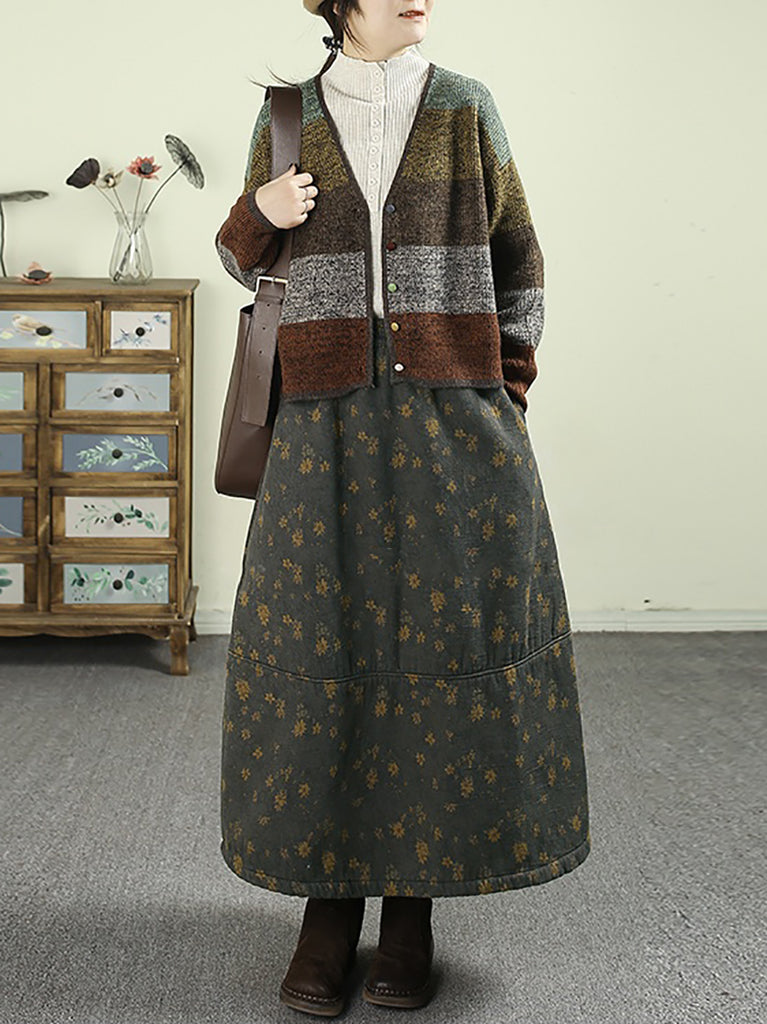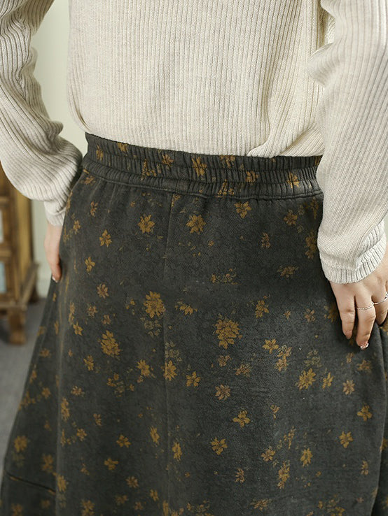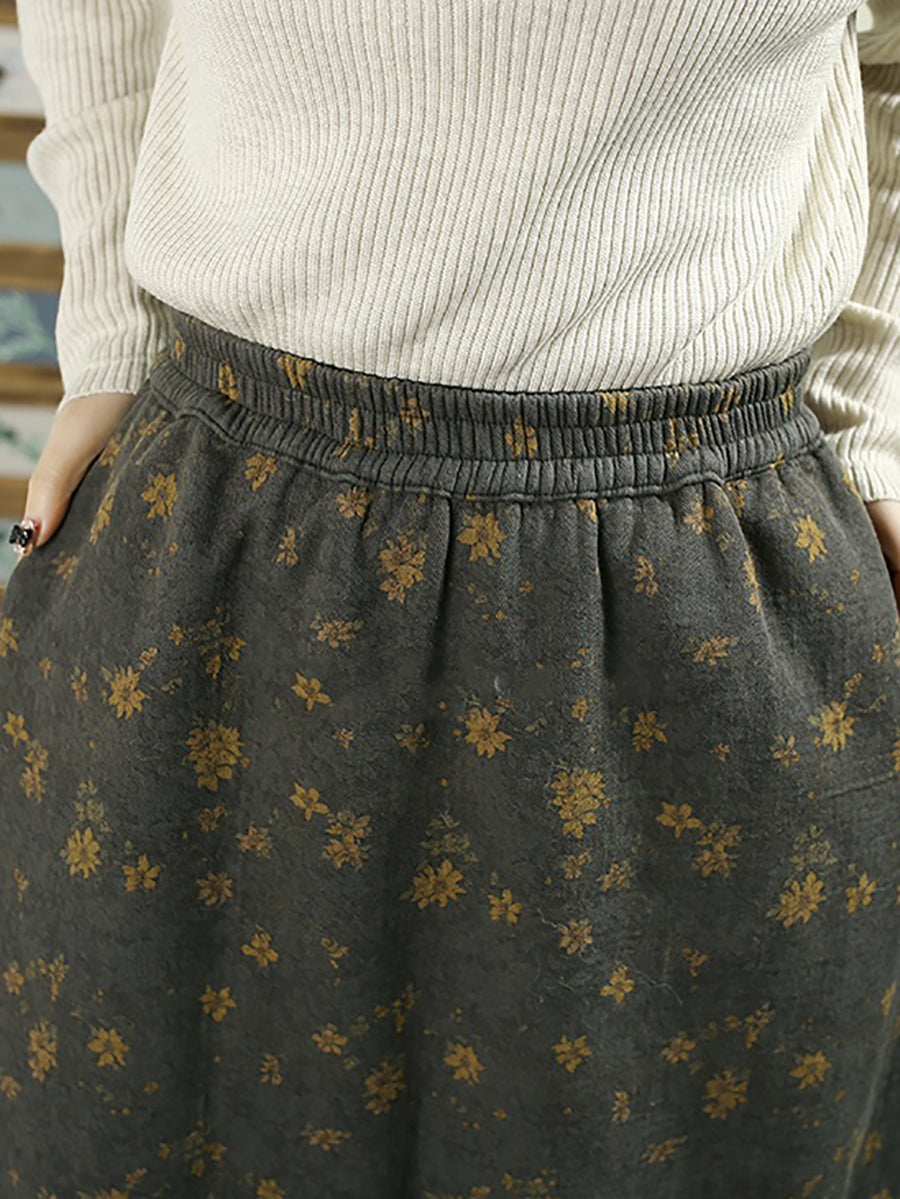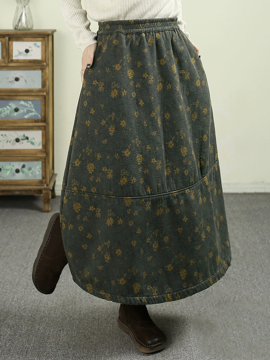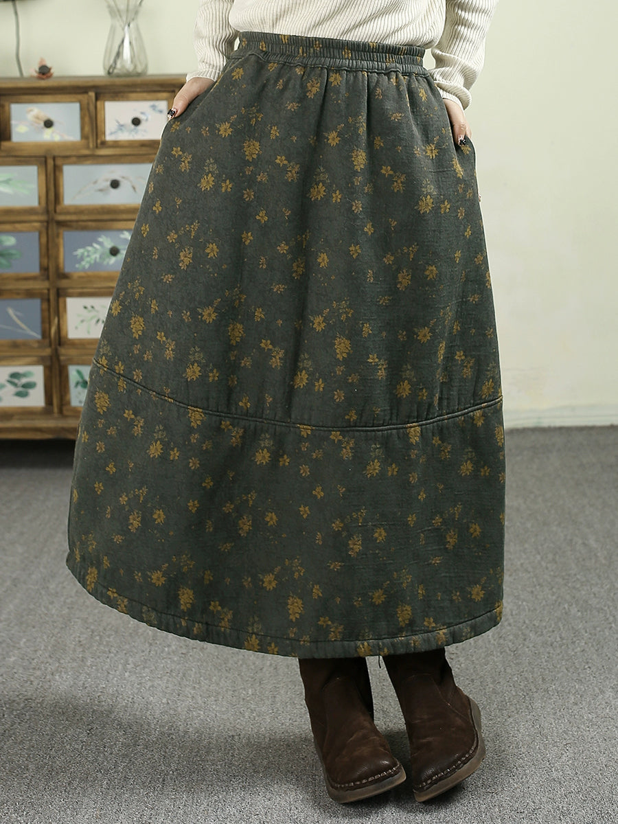 חצאית חורף פרחונית 100% כותנה לנשים בצורת A עם בטנת פליז