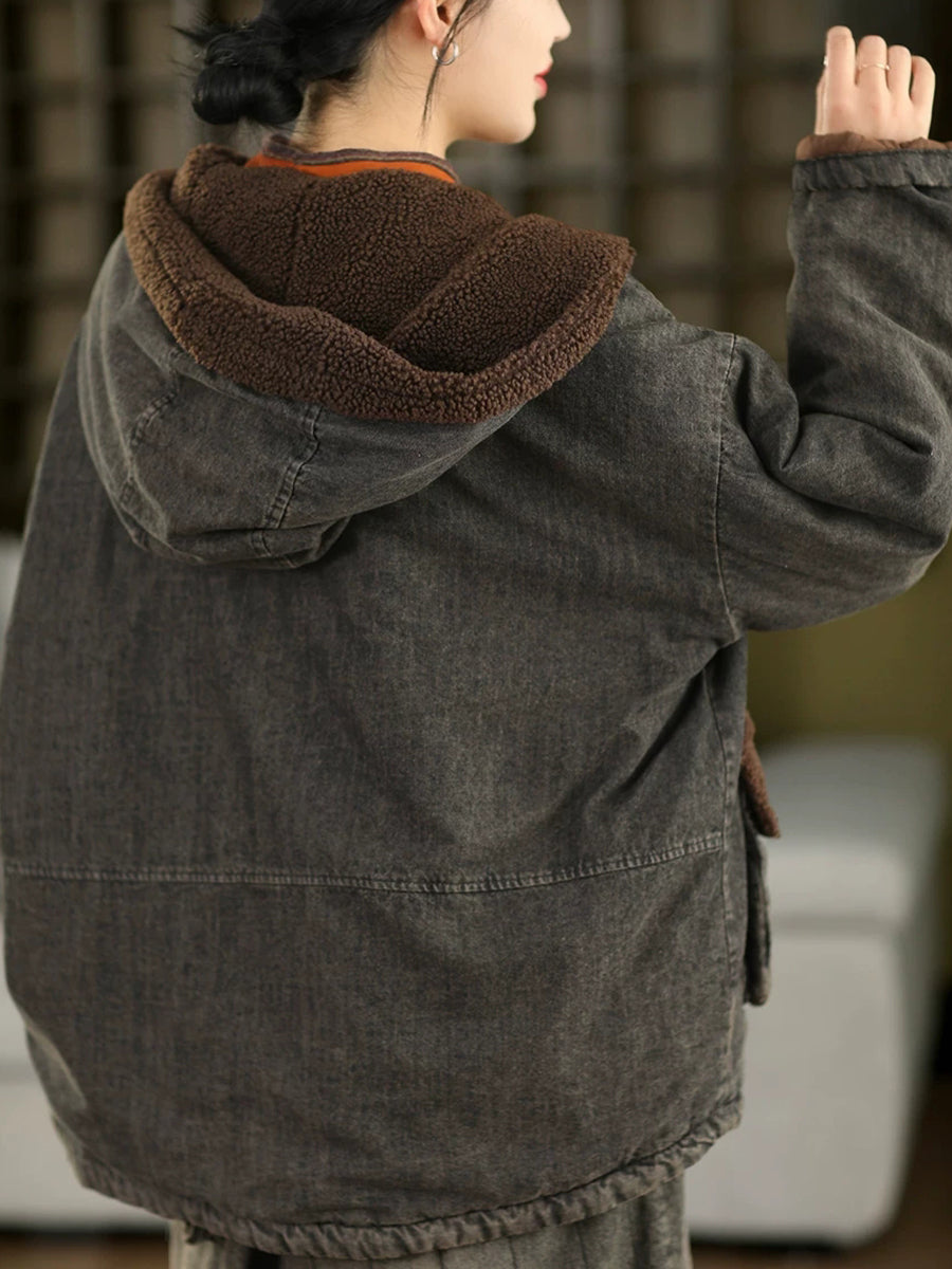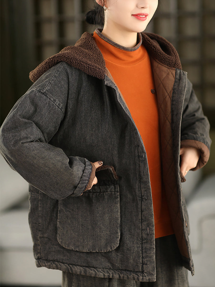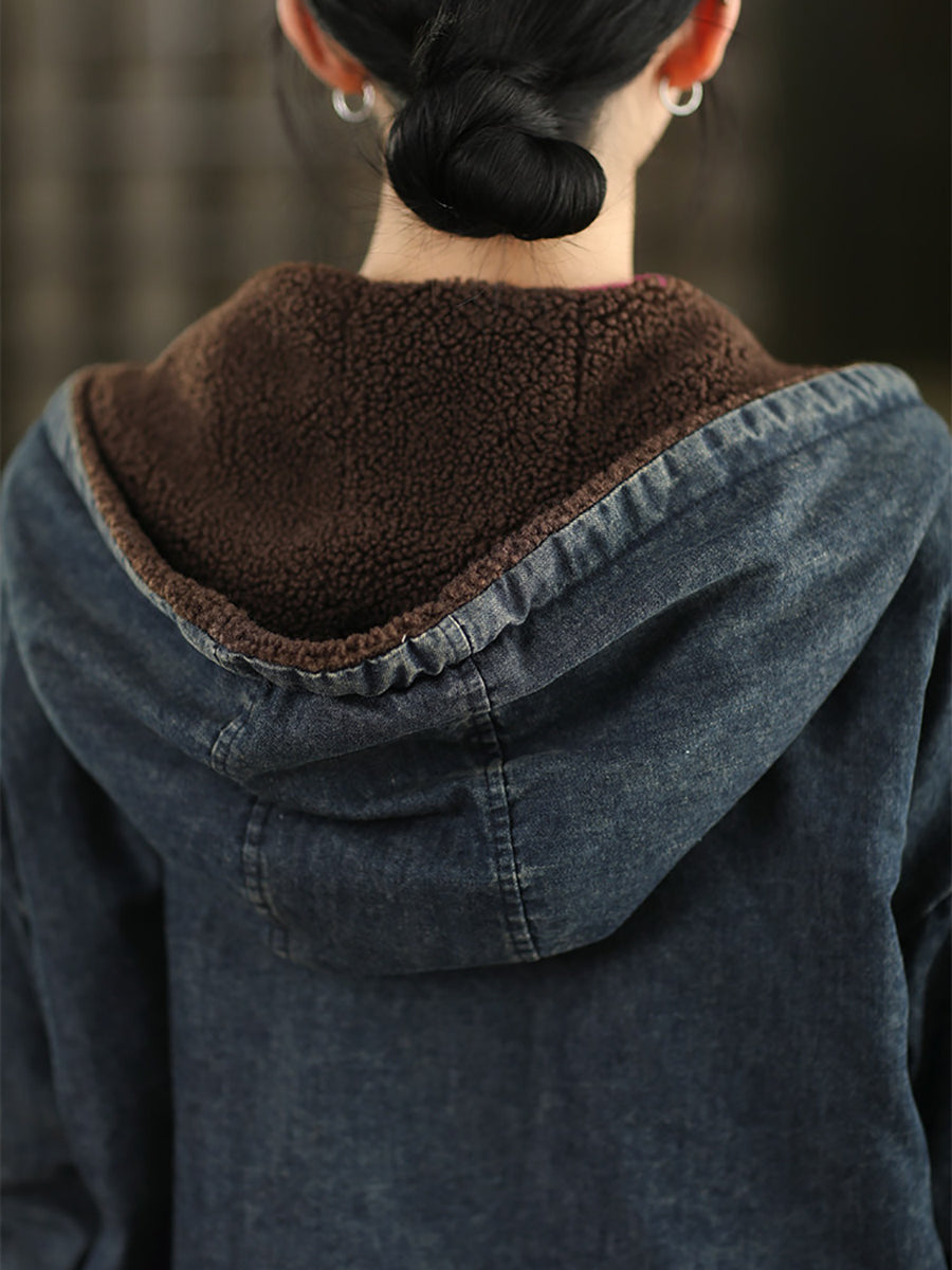 מעיל חורף רטרו ג'ינס פליז מרופד עם ברדס לנשים