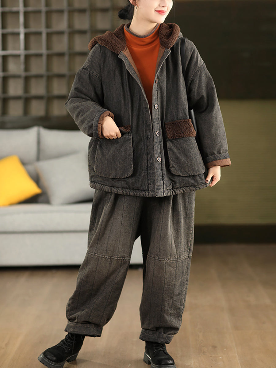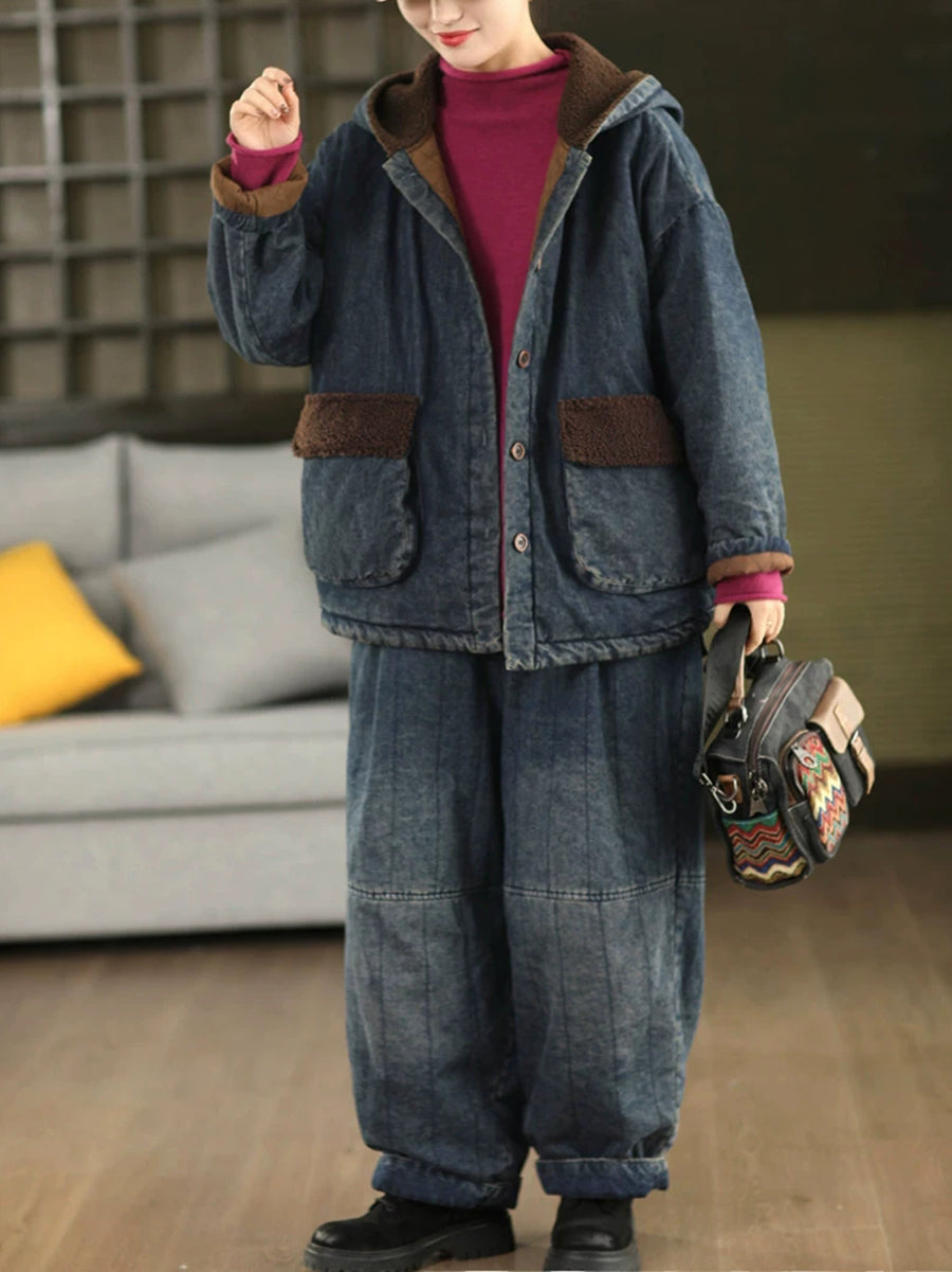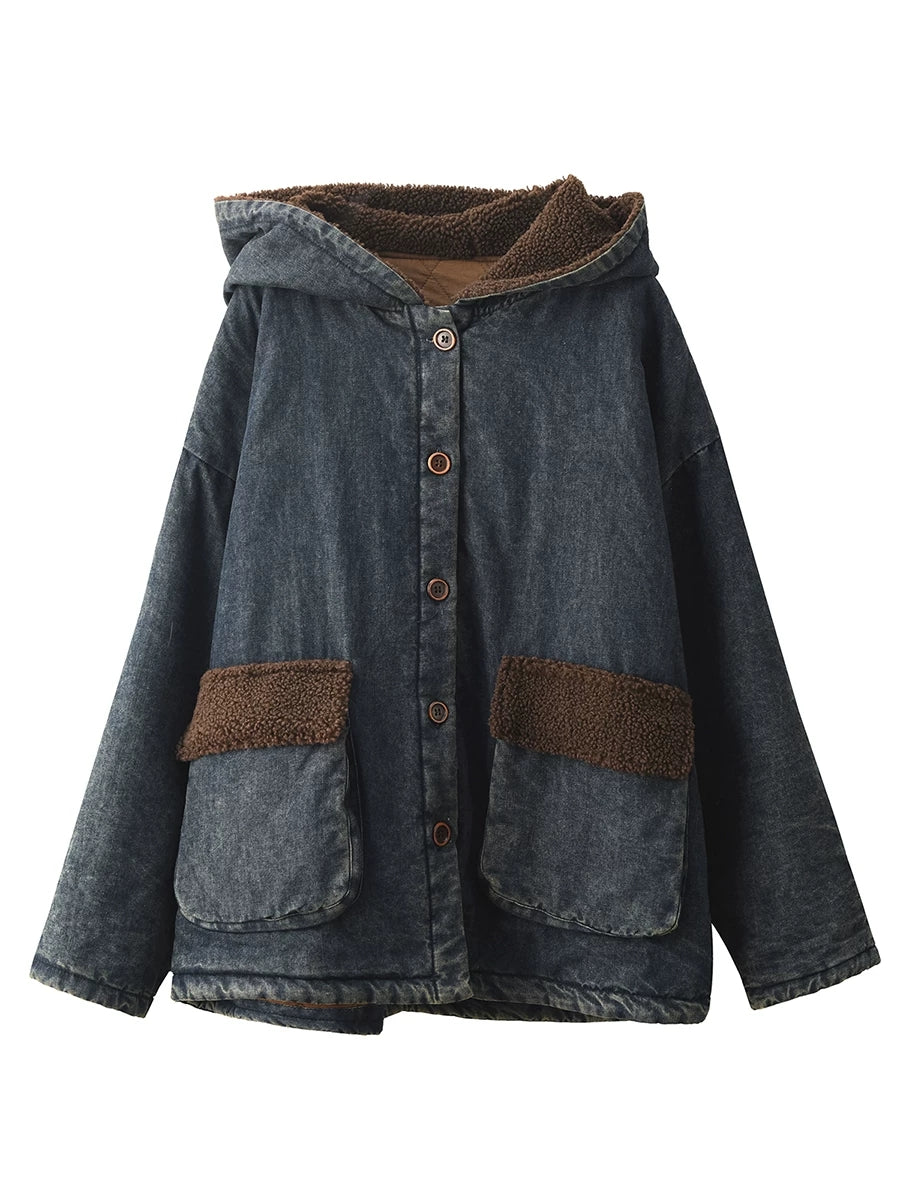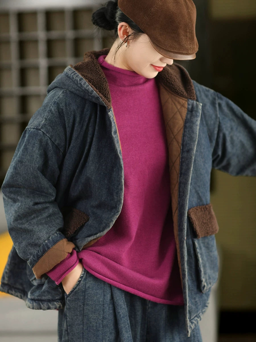 מעיל חורף רטרו ג'ינס פליז מרופד עם ברדס לנשים