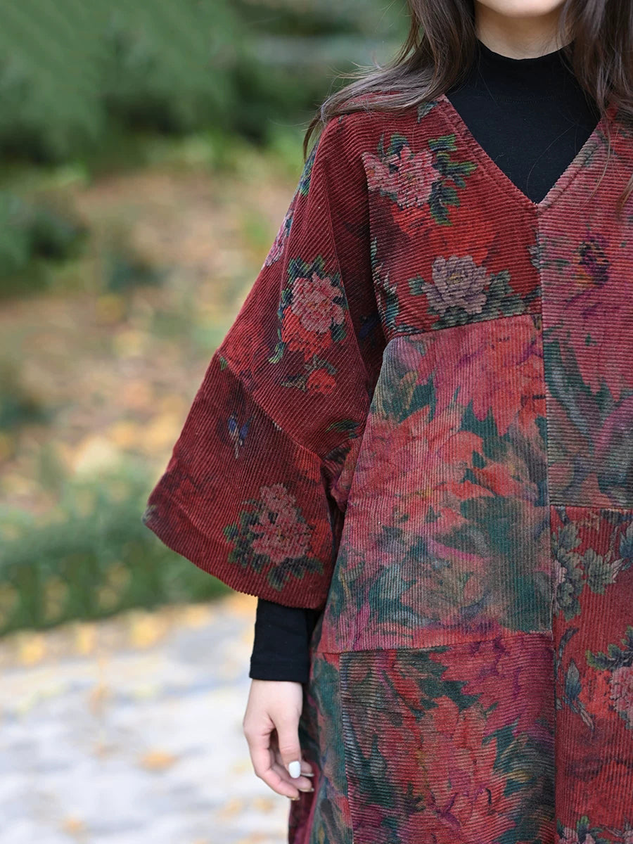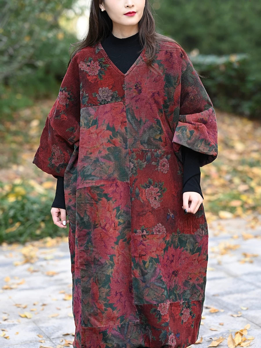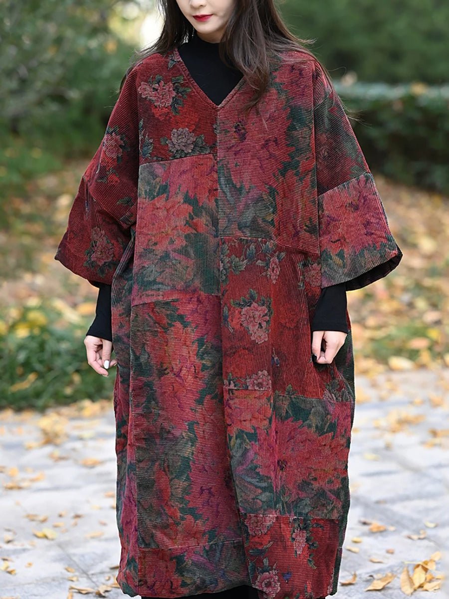 מעיל חורף וינטג' עם טלאי פרחים וצווארון V לנשים